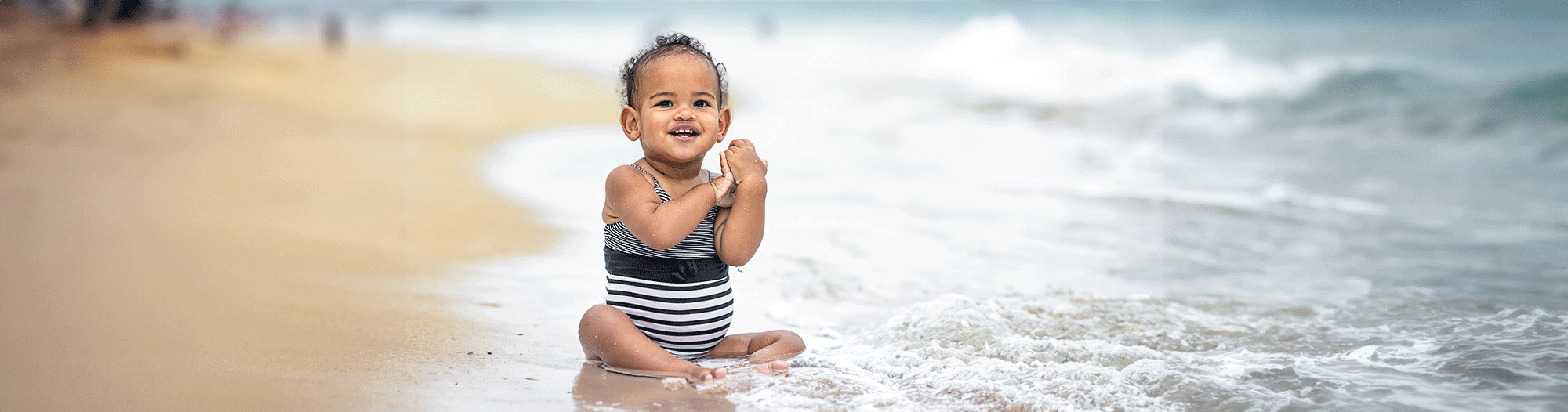 The sand at the beach can be very hot to walk on for sensitive little feet, and there can be shells, stones and other sharp objects in the water. Remember to pack a pair of water shoes or beach sandals for your baby so you can keep their feet protected.