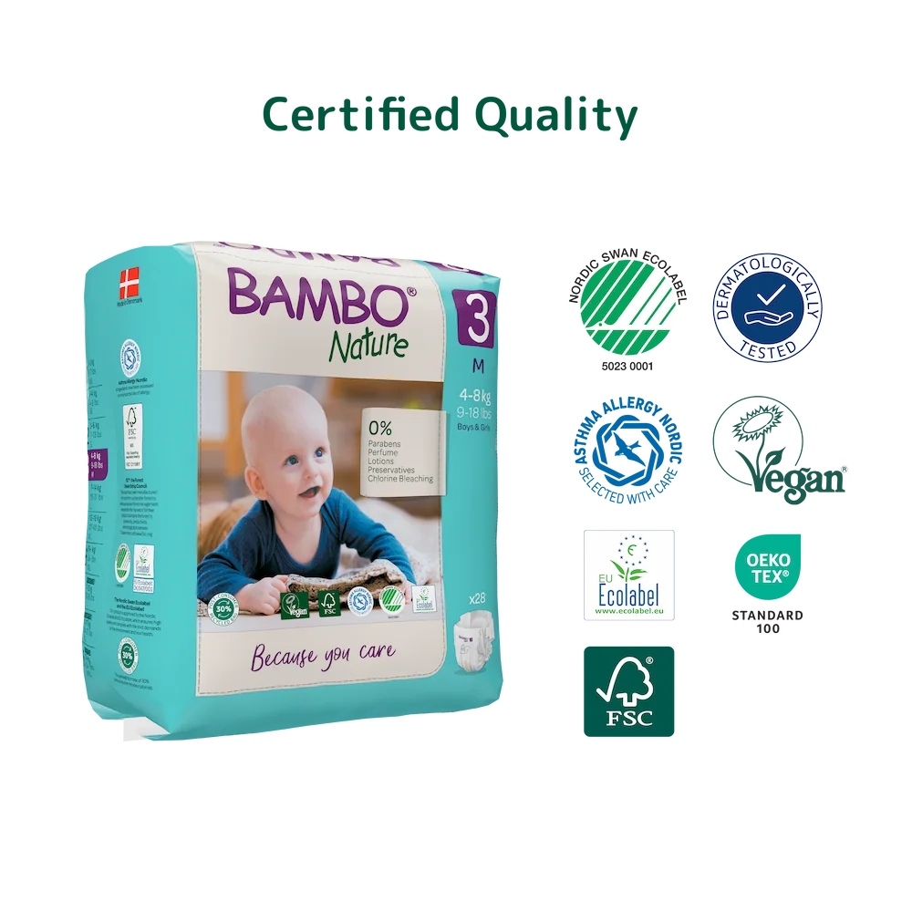 Bambo Nature baby diapers are certified by some of the world’s strictest third-party certifications, including the Nordic Swan Ecolabel and the FSC™ (Forest Stewardship Council), so you can trust that every diaper is made with care.