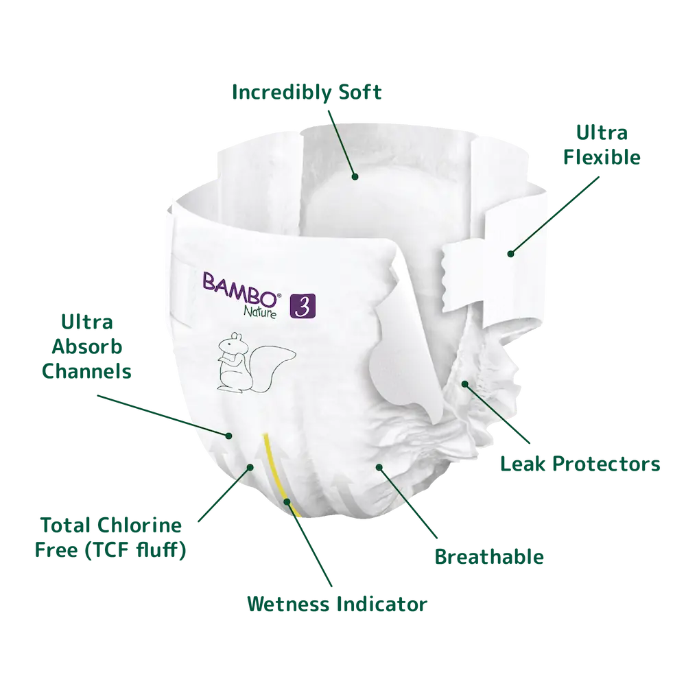 Every day is an adventure for your little one, and Bambo Nature diapers are made to keep up. With our soft, breathable design and super-absorbent core, your child can play and explore comfortably. Thanks to our advanced channel technology, liquid spreads out quickly and is absorbed rapidly, keeping your baby dry and comfortable – even overnight. Plus, the handy wetness indicator lets you know exactly when it’s time for a change.