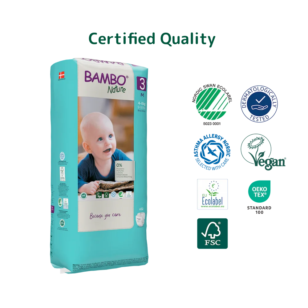 Bambo Nature baby diapers are certified by some of the world’s strictest third-party certifications, including the Nordic Swan Ecolabel and the FSC™ (Forest Stewardship Council), so you can trust that every diaper is made with care.