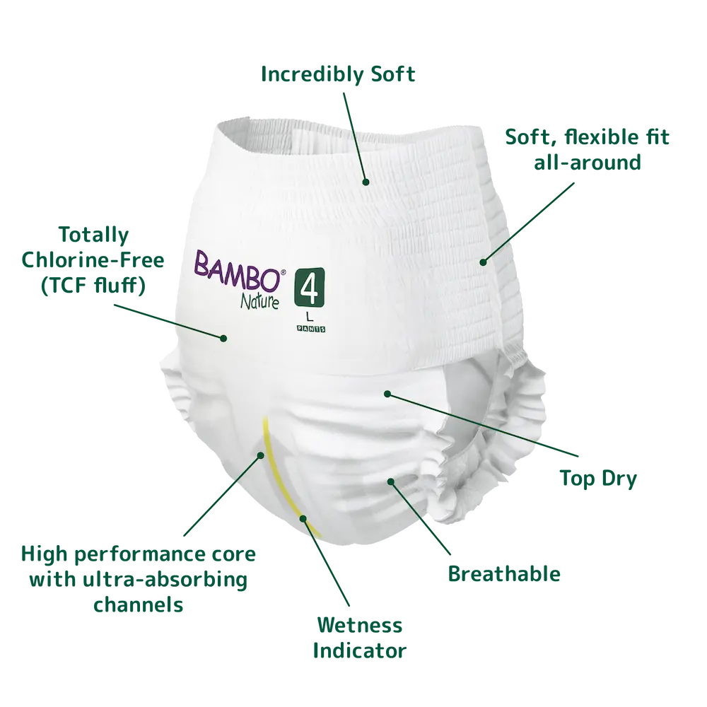 The Bambo Nature Pants have a soft, flexible fit all-around, are comfortable, and keep even the most sensitive skin dry. Easy for little hands to pull up and down and ideal for potty training. Designed with a super-absorbent core, including the latest channel technology, that leads moisture away from the child’s skin quickly and holds up to multiple wettings.